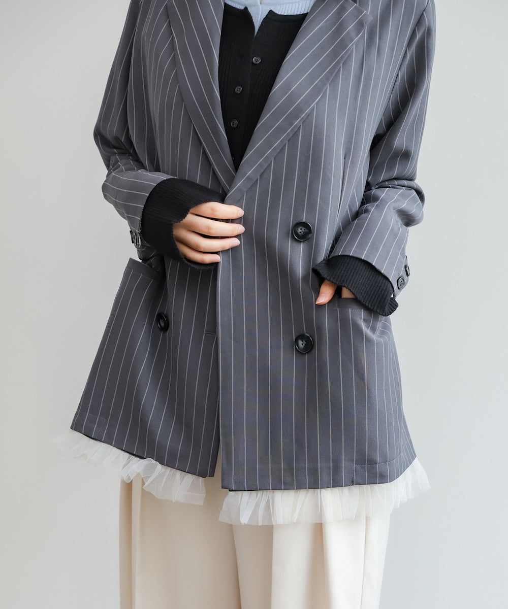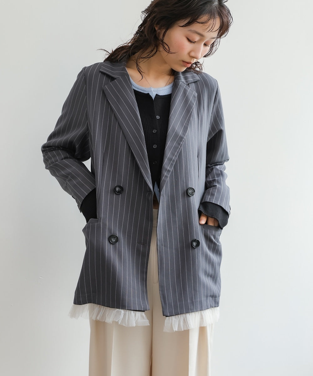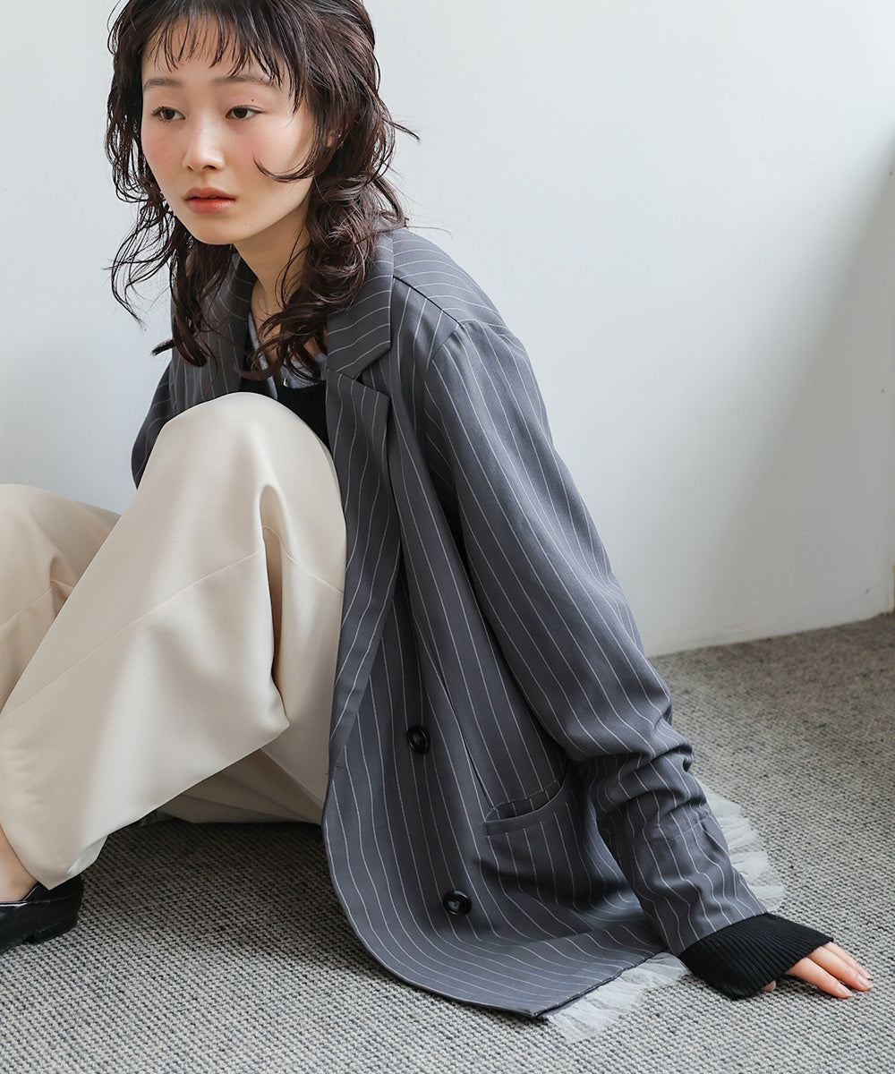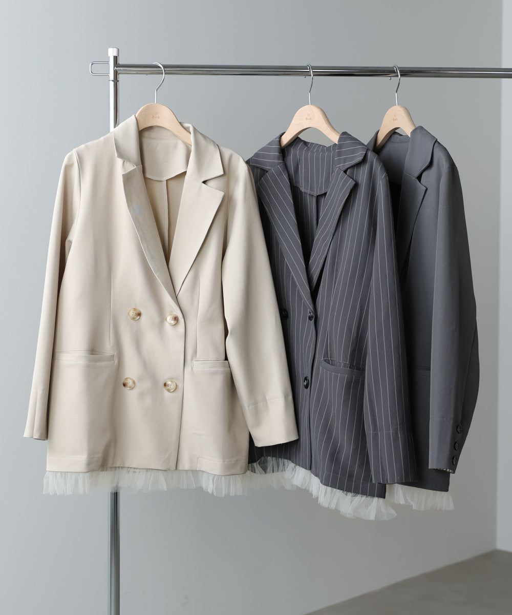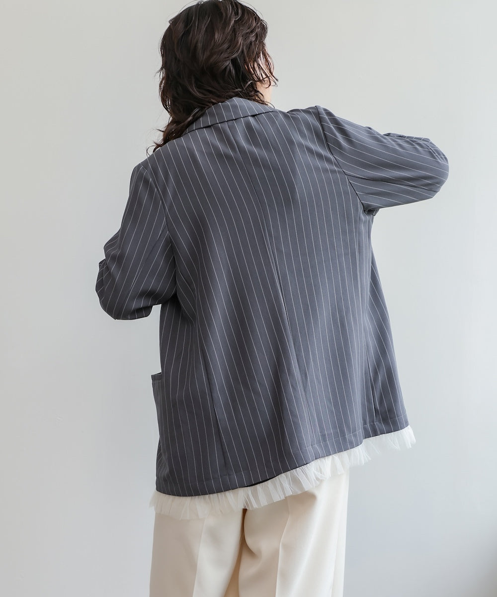 裾にあしらったフリルチュールが目を引く、ダブル仕様のテーラードジャケット。きちんと感のあるシルエットに、甘さをプラスしたデザインで、オンオフ問わず着回しやすい一着です。裾のチュールは取り外し可能なので、シーンや気分に合わせて表情を変えられるのも嬉しいポイント。同素材のジレとパンツと合わせれば、セットアップとしても楽しめ、単品使いでもコーデの主役に。チャコール・ベージュ・グレーストライプの3色展開で、それぞれ異なる雰囲気を演出します。
