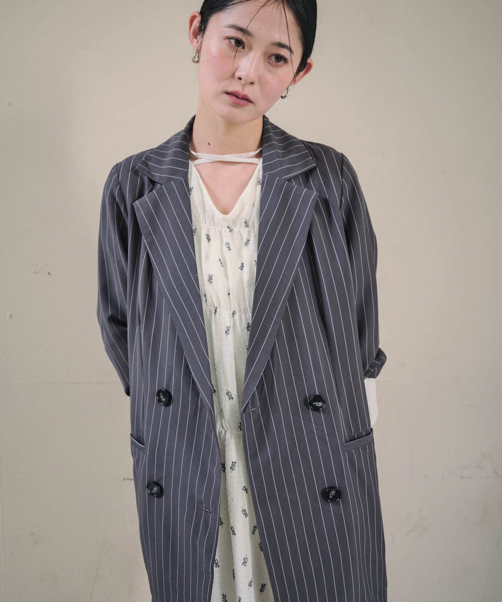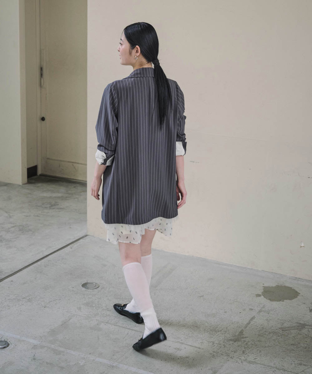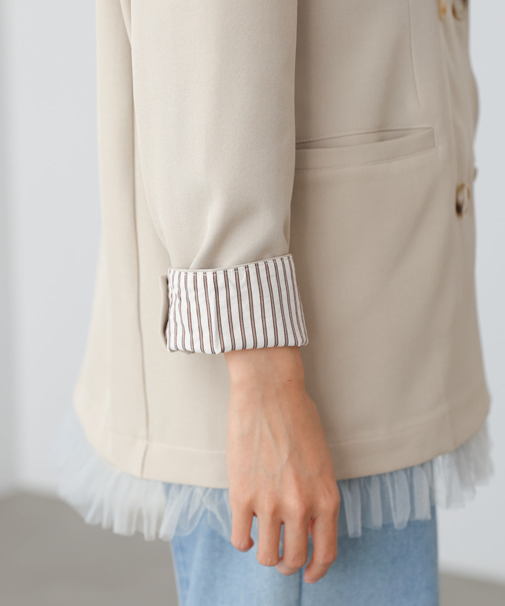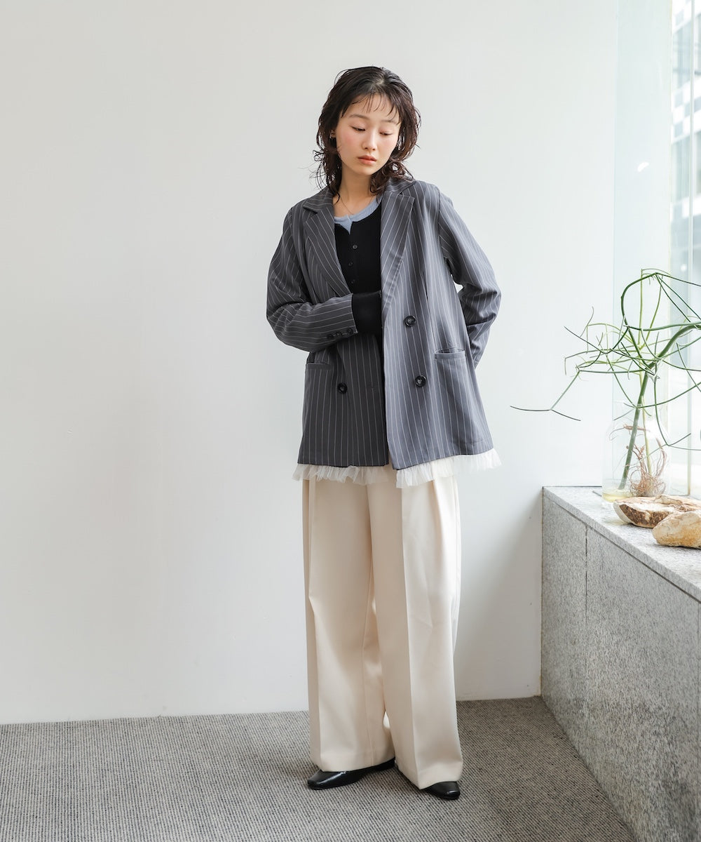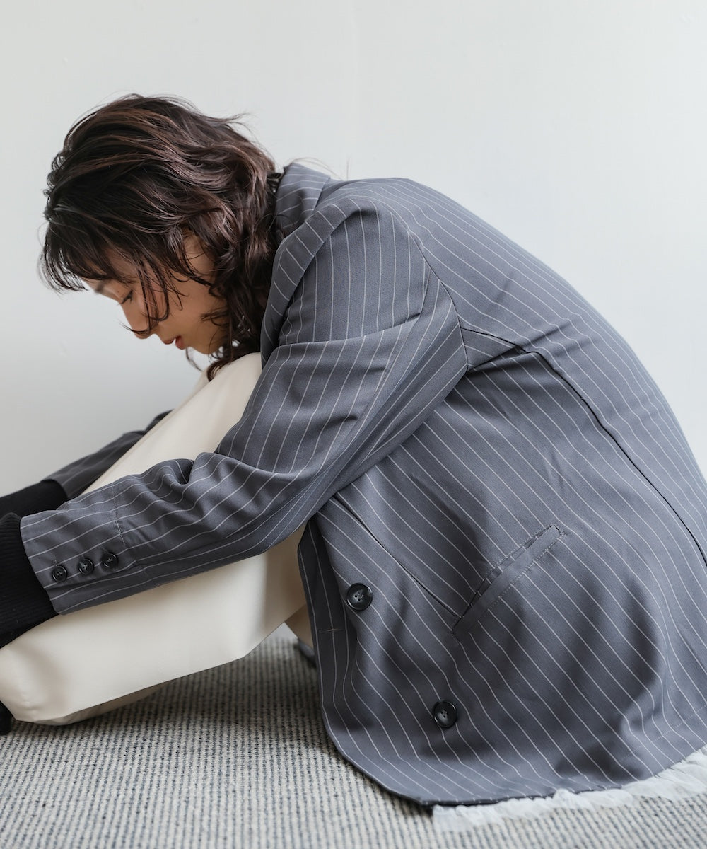 裾にあしらったフリルチュールが目を引く、ダブル仕様のテーラードジャケット。きちんと感のあるシルエットに、甘さをプラスしたデザインで、オンオフ問わず着回しやすい一着です。裾のチュールは取り外し可能なので、シーンや気分に合わせて表情を変えられるのも嬉しいポイント。同素材のジレとパンツと合わせれば、セットアップとしても楽しめ、単品使いでもコーデの主役に。チャコール・ベージュ・グレーストライプの3色展開で、それぞれ異なる雰囲気を演出します。