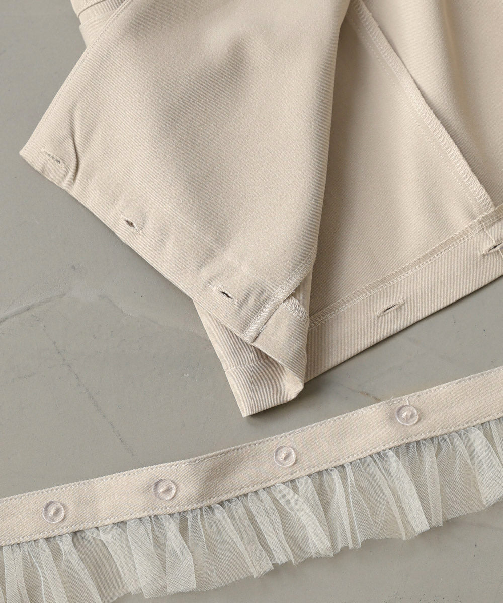 本体はポリエステルをベースに、ポリウレタンを混紡することで程よいストレッチ性をプラス。別布部分にはポリエステル×綿素材を使用し、シャツのような軽やかさとハリ感を演出します。チュール部分はナイロン100%で、繊細な透け感が女性らしさを引き立てる素材感です。異素材を組み合わせながらも、全体的にバランスよく仕上げています。