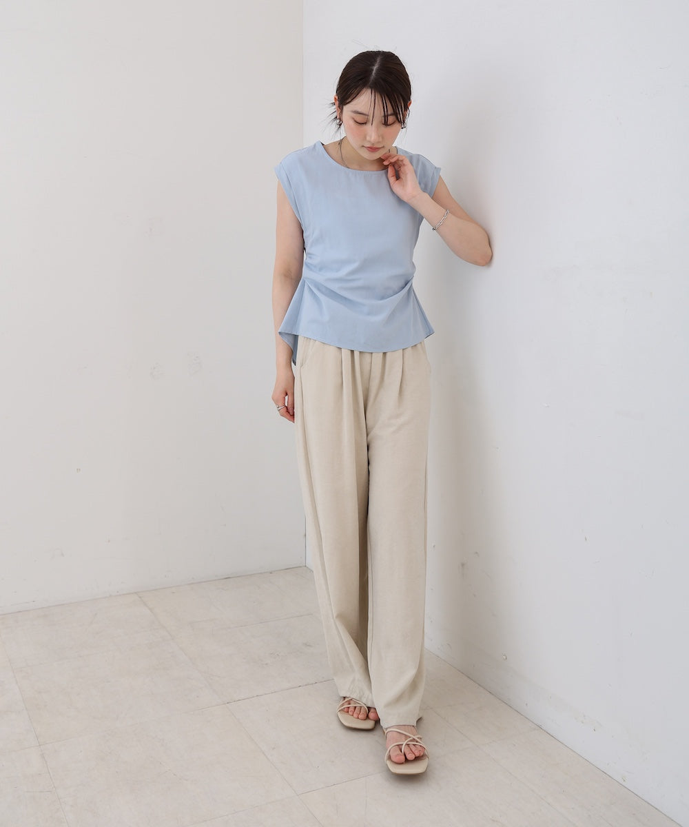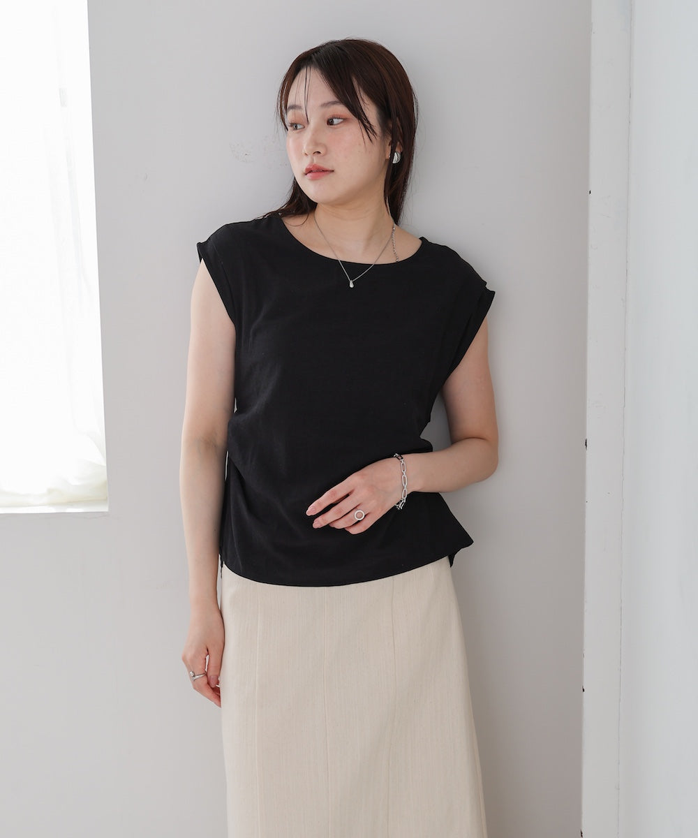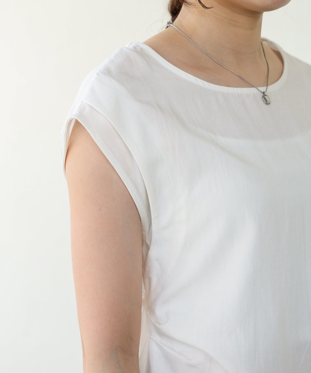 後ろ姿まで抜かりなく、さりげない肌見せで大人の抜け感を演出するノースリーブブラウス。シンプルなフロントに対して、バックスタイルに遊び心を効かせたデザインが魅力です。程よくハリのある素材感で、きれいめにもカジュアルにも使いやすい万能アイテム。ノースリーブながら肩まわりは広めの設計で、腕をスッキリ見せつつ安心感のある着心地です。暑い季節に涼しく着られるだけでなく、後ろ姿で差がつく一枚です。