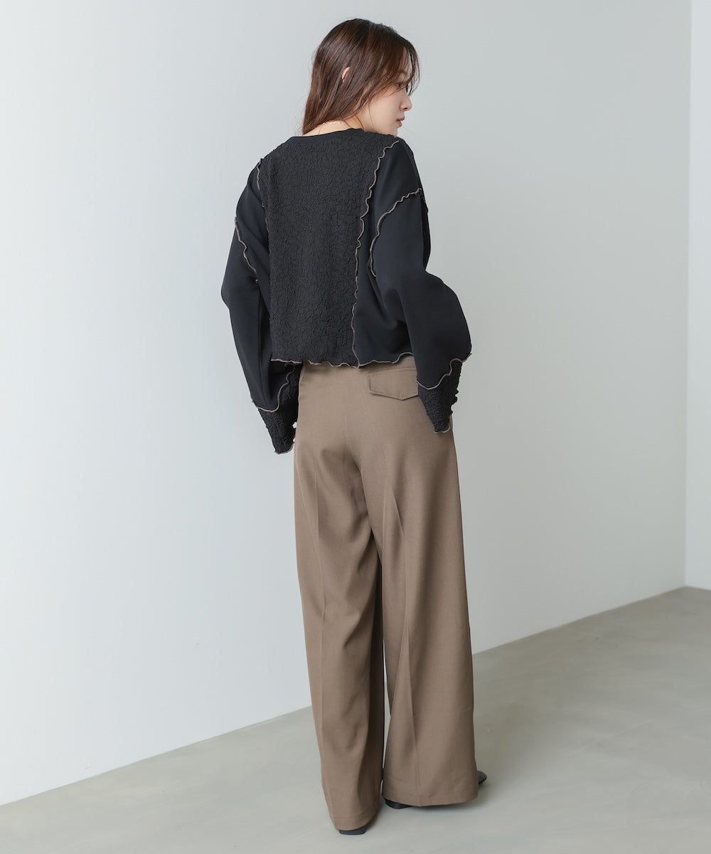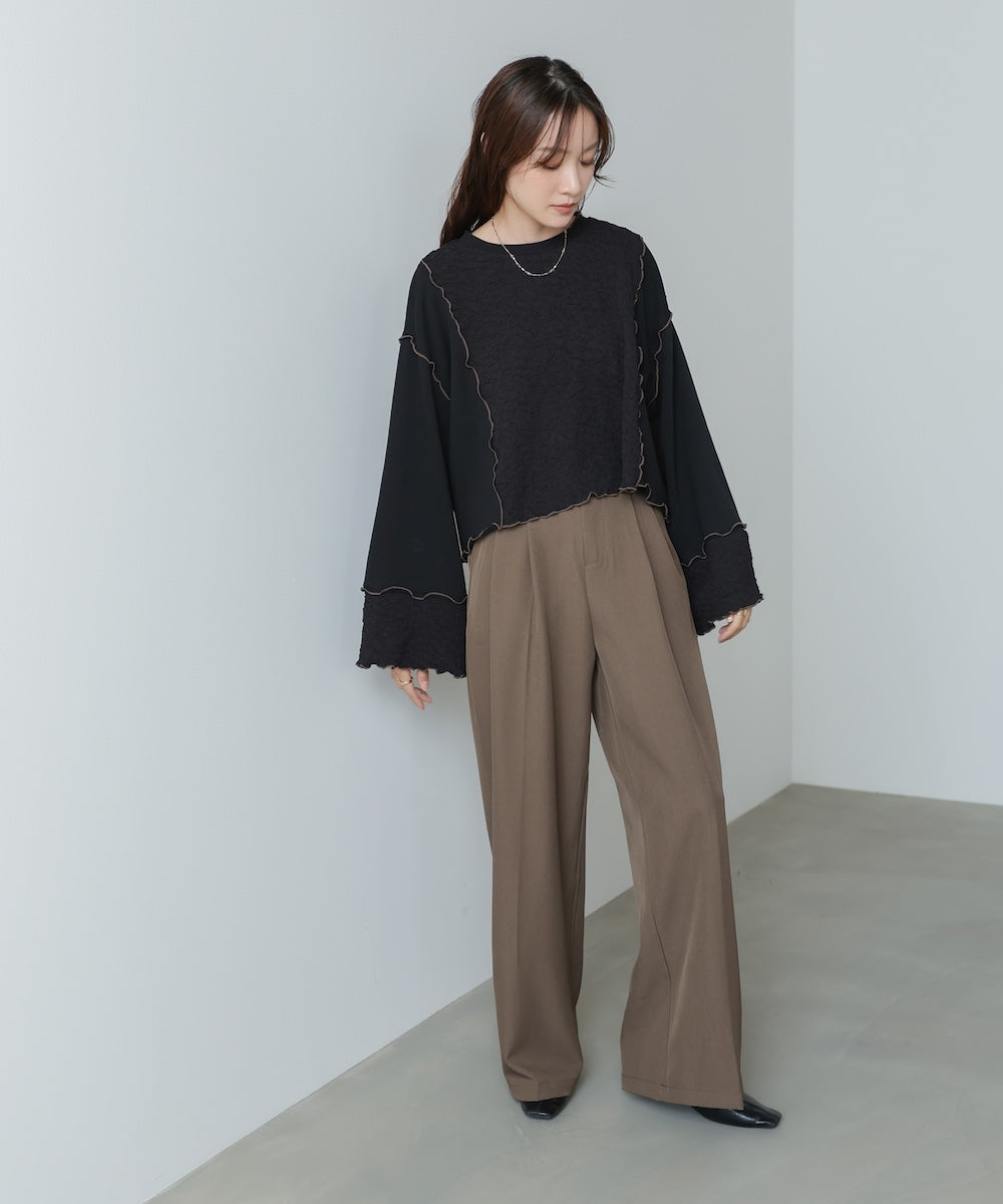 さらりとした肌触りでシワになりにくく、デイリー使いに適しています。軽やかさと程よい落ち感があり、きれいなシルエットをキープできるのも魅力です。