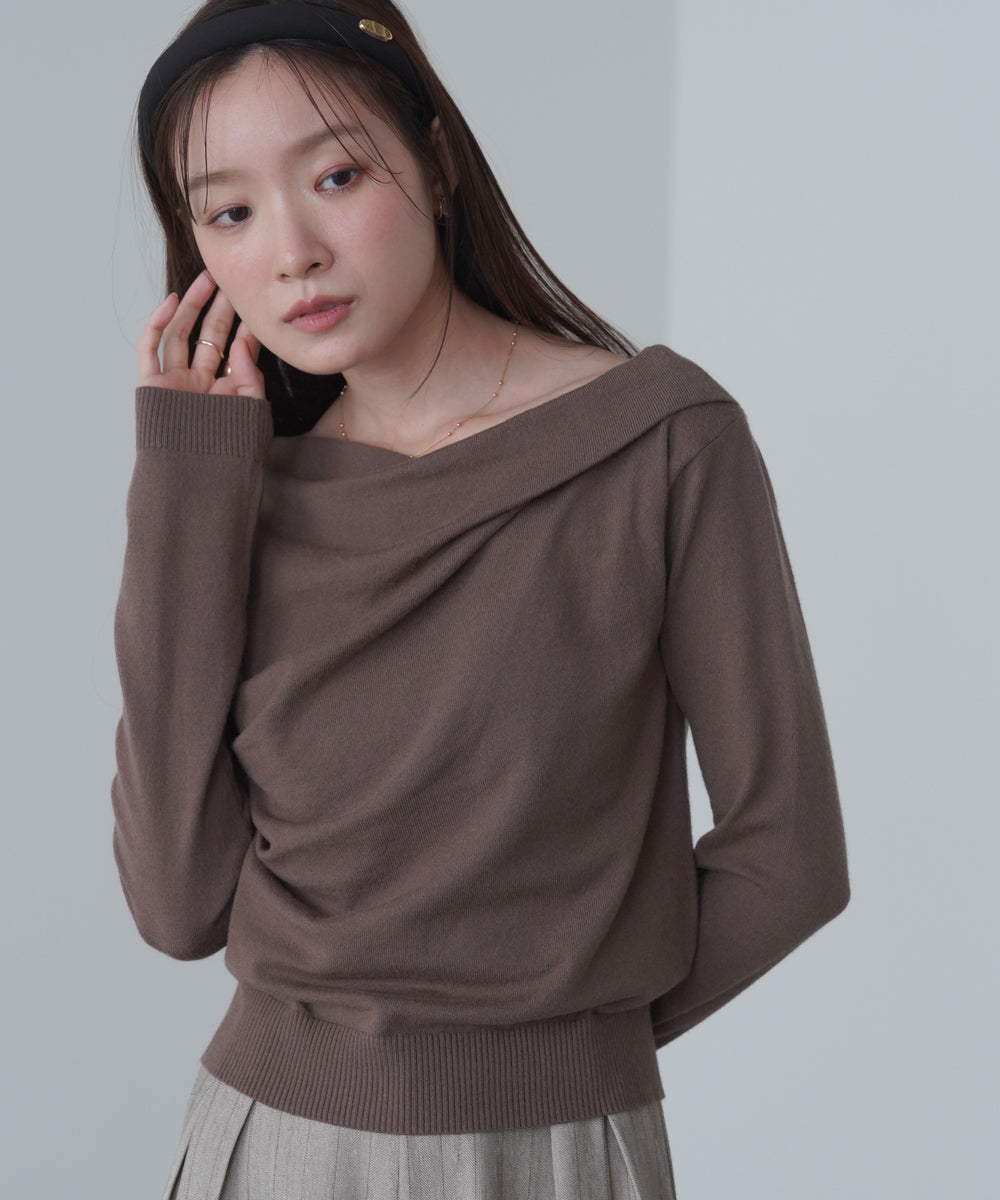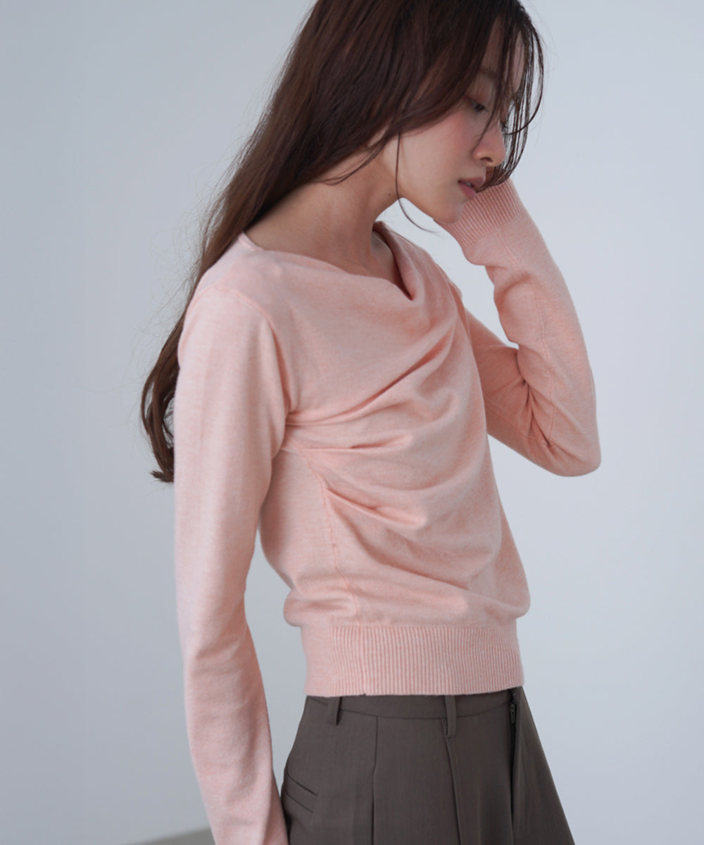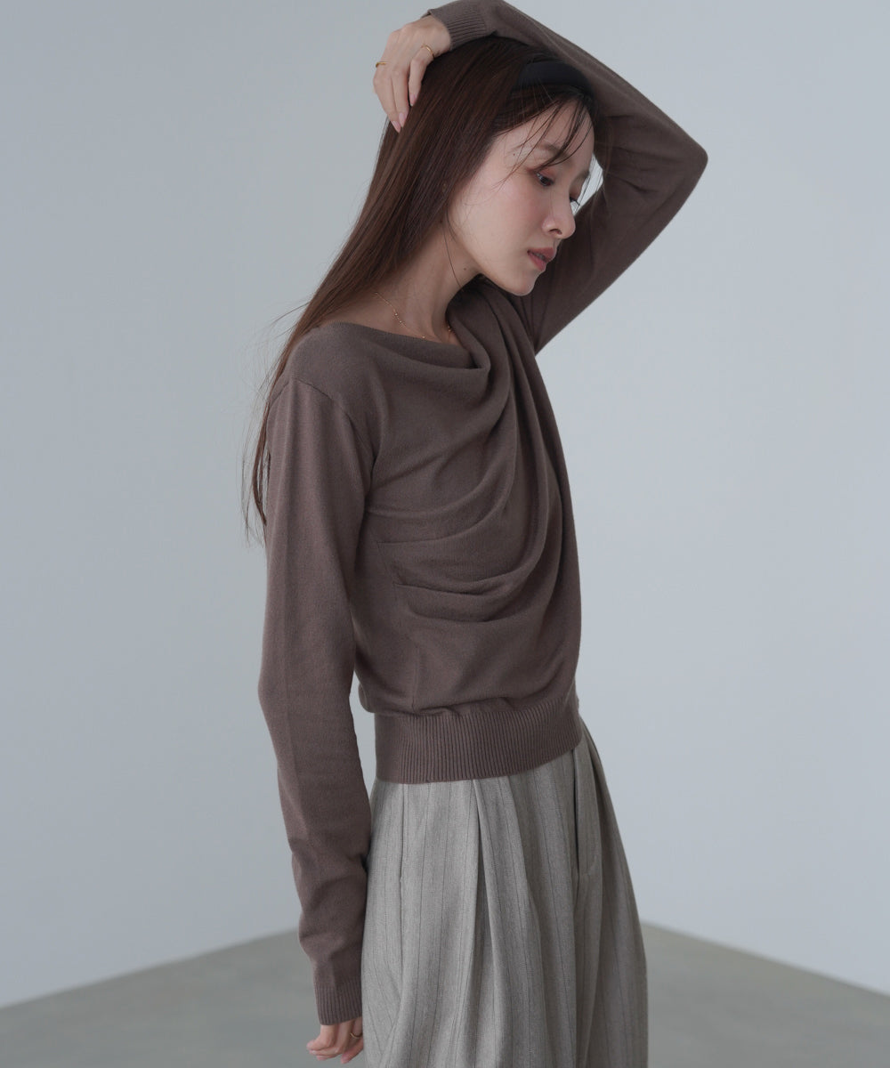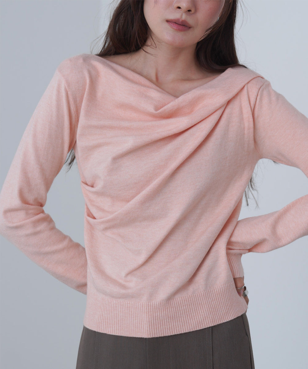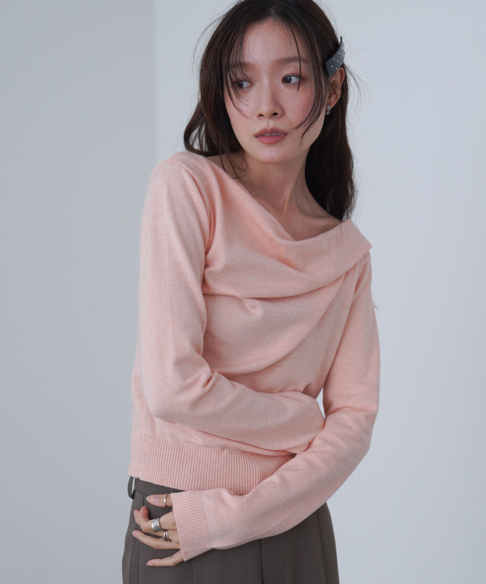 使いやすさ抜群のドレープトップスから長袖ニットが登場!シンプルながらも存在感を放つ、クロスデザインのドレープニットプルオーバー。全体的に入ったドレープが自然な立体感を生み出し、顔まわりをすっきりと見せてくれます。韓国テイストを感じる洗練されたシルエットで、1枚で着るだけでスタイルが完成するのも嬉しいポイント。ベーシックなアイボリー・チャコール・ブラウンに加え、柔らかくフェミニンな印象のピンクもラインナップ。カラーによって雰囲気が大きく変わり、幅広いシーンで活躍するアイテムです。シンプルなデザインだからこそ、アクセサリーや小物でアレンジを楽しめます。