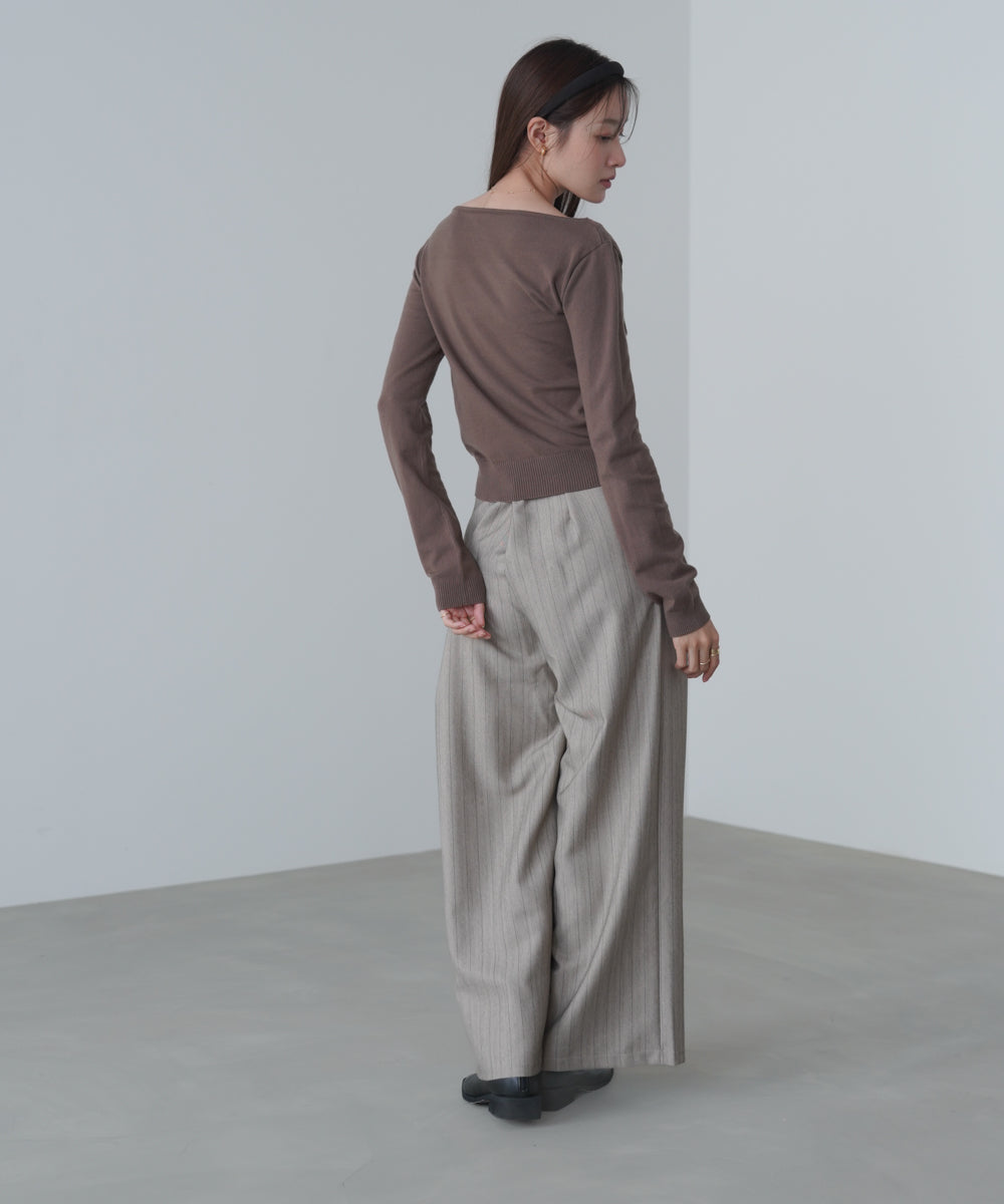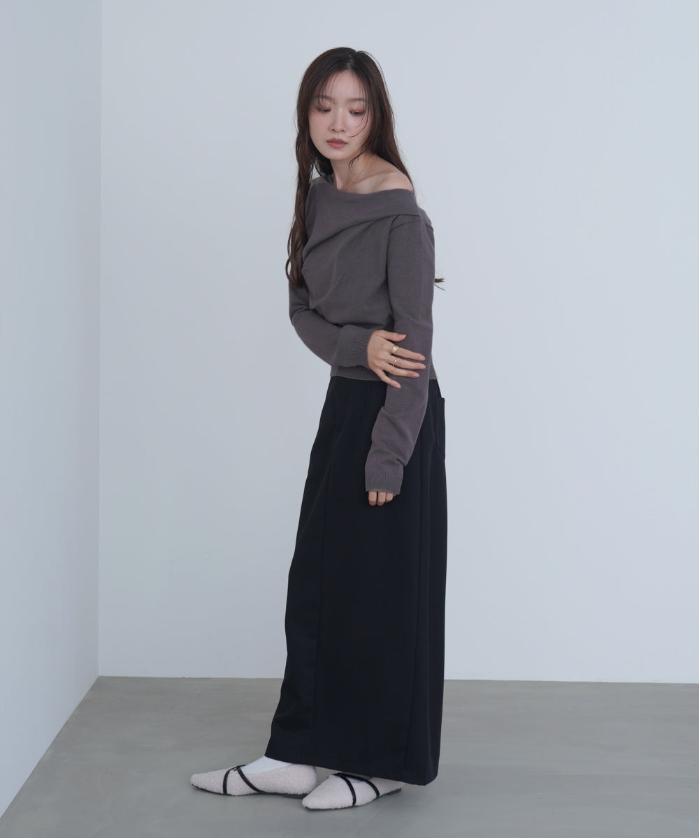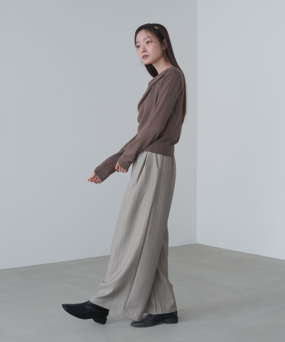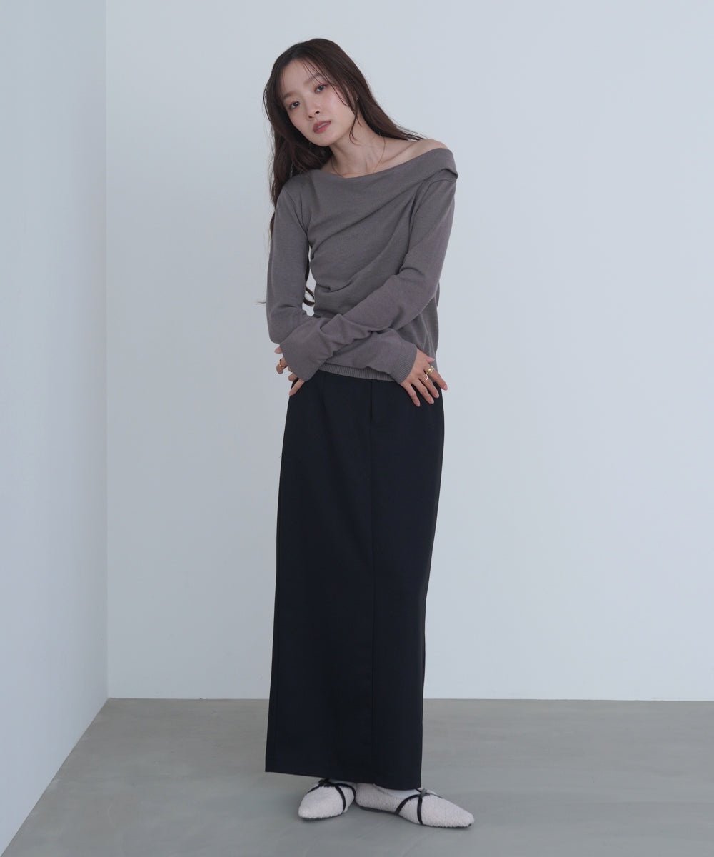 スラックスと合わせてオフィスカジュアルコーデに。サテンスカートと合わせるとドレープ部分とサテンの生地が合わさって上品な雰囲気になります。